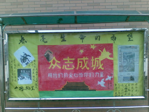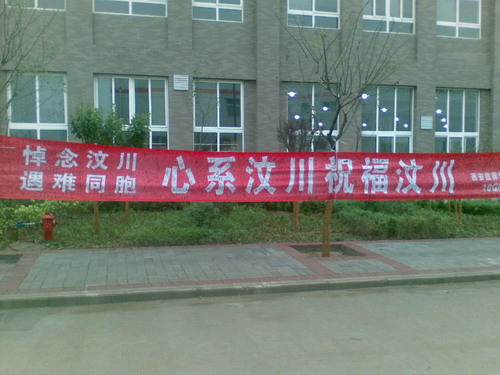 5月8日至12日,校區(qū)懸掛“心系汶川祝福汶川”簽名橫幅,寄托哀思,并以板報、廣播的形式宣傳地震知識和急救處理常識;