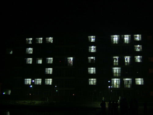 5月12日晚8:30校區(qū)公寓樓熄燈,用宿舍燈光打出5.12數(shù)字,這是一個讓人們永遠(yuǎn)銘記在心底的時刻,一個將悲痛和淚水載入史冊的時刻;