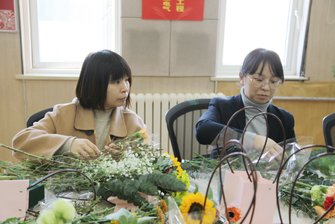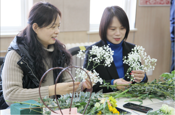 “學(xué)院工會今年‘三八’活動形式非常新穎,和同事們一起學(xué)習(xí)花藝,感覺在緊湊的教學(xué)工作中那份緊張的心情得到了放松,感覺很溫馨?!爆F(xiàn)代服務(wù)系教師常薇說。