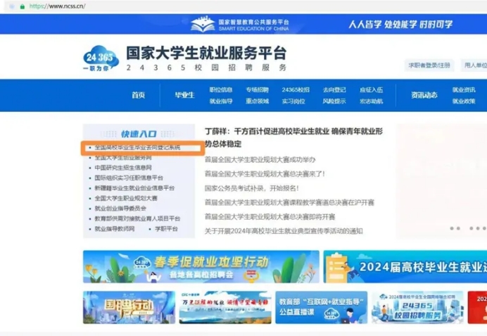 搜索“國(guó)家大學(xué)生就業(yè)服務(wù)平臺(tái)”網(wǎng)站,網(wǎng)址:https://www.ncss.cn/點(diǎn)擊“快速入口”中“全國(guó)高校畢業(yè)生畢業(yè)去向登記系統(tǒng)”(或直接輸入網(wǎng)址:https://dj.ncss.cn/),選擇“畢業(yè)生去向登記”。
