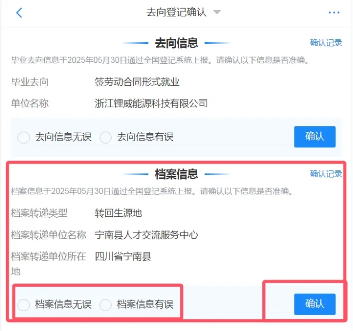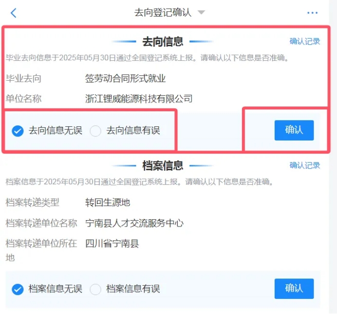 ②若信息有誤,選擇“去向信息有誤”,并更新信息,再進(jìn)行登記確認(rèn)。