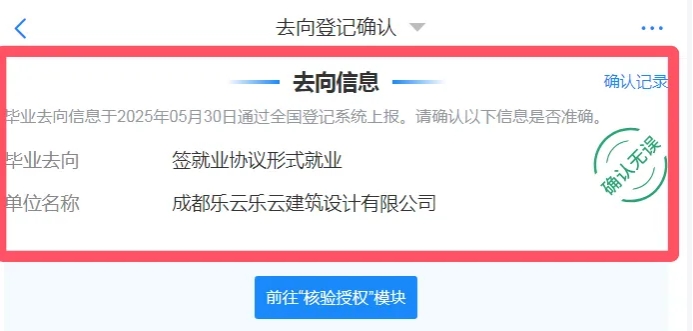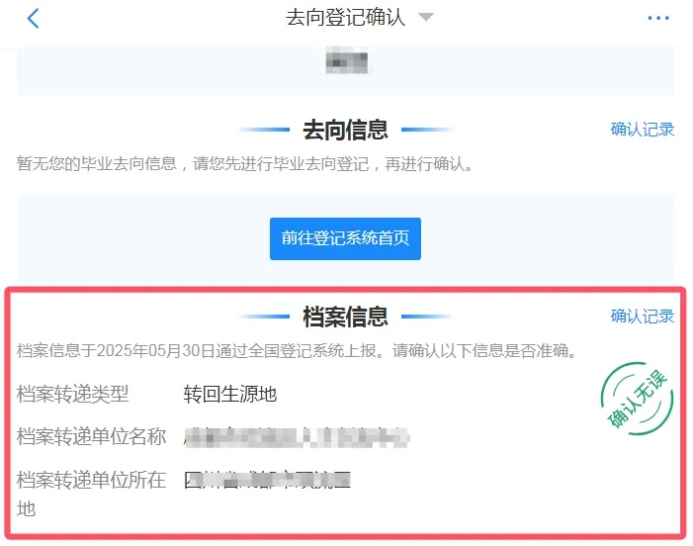①若核對(duì)信息無(wú)誤,選擇“去向信息無(wú)誤”,點(diǎn)擊“確認(rèn)”。