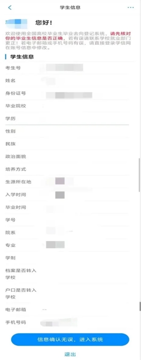 首次登錄要先進(jìn)入畢業(yè)生基本信息確認(rèn)頁(yè)面,點(diǎn)擊“信息確認(rèn)無(wú)誤,進(jìn)入系統(tǒng)”,如信息有誤,聯(lián)系學(xué)院招就中心更改。不是首次登錄,會(huì)直接進(jìn)入去向登記確認(rèn)系統(tǒng)。