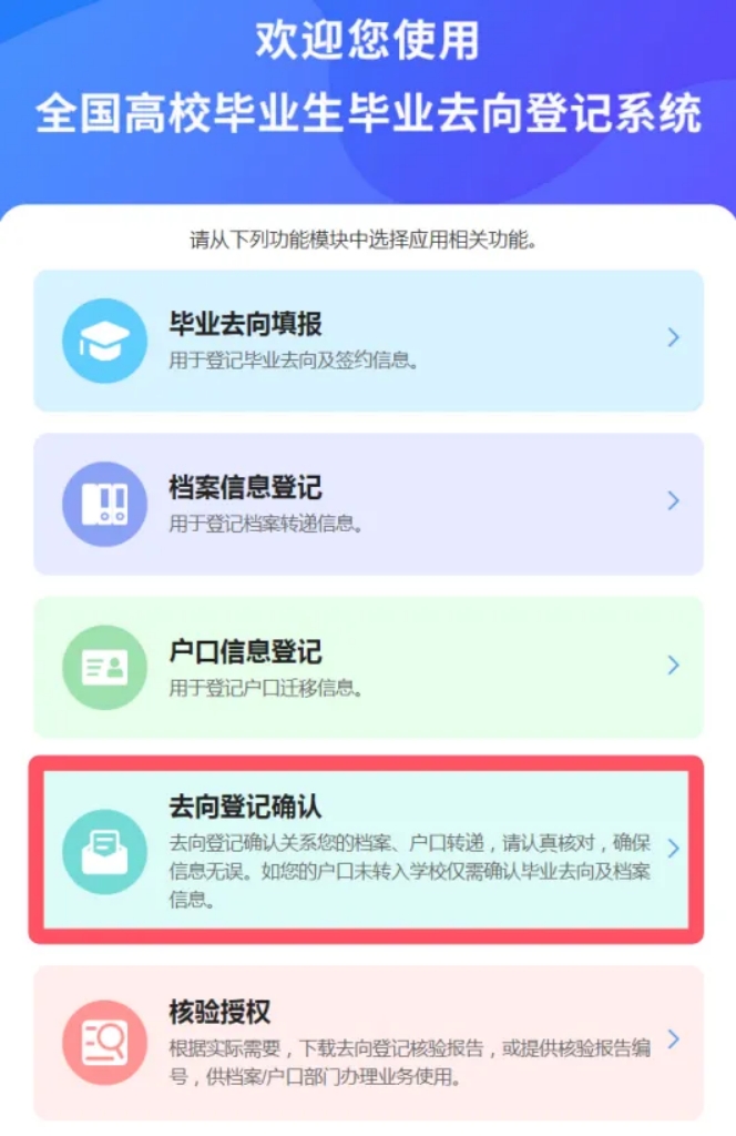 畢業(yè)生選擇進(jìn)入“去向登記確認(rèn)”模塊。注意:畢業(yè)生需先在全國(guó)登記系統(tǒng)完成畢業(yè)去向填報(bào)才能進(jìn)行確認(rèn)。