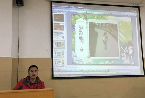 喻飛飛老師在講“跑步中需要注意的事項(xiàng)以及預(yù)防措施”。在闡述了全面提高身體素質(zhì)時(shí)跑步的重要性后,喻老師用情景教學(xué)法著重講解和演示了跑步的注意事項(xiàng)以及預(yù)防措施。