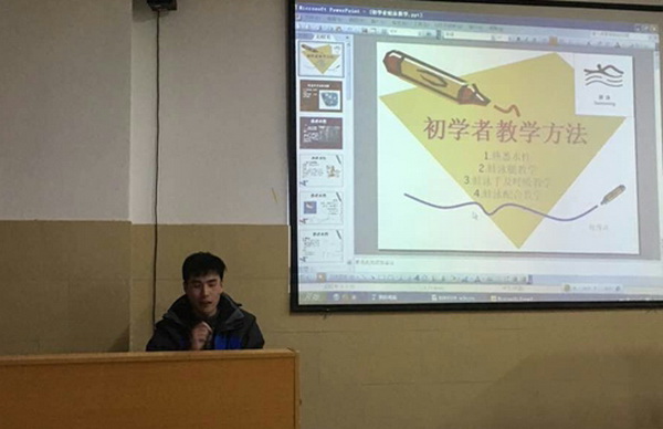 楊博森老師在講“游泳初學(xué)者學(xué)習(xí)方法”。楊老師認(rèn)真詳細(xì)的講解,再加上視頻動(dòng)作分解,使游泳初學(xué)者對(duì)動(dòng)作的學(xué)習(xí)一目了然。