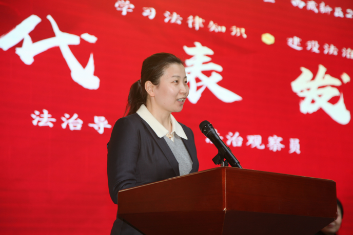 西咸新區(qū)檢察院王瑜檢察官、學(xué)院學(xué)生管理服務(wù)中心裘琛老師、先進(jìn)制造系張少迪同學(xué)分別作為校外法治導(dǎo)師、法治觀察員、法治宣傳員代表上臺發(fā)言。他們結(jié)合自身工作實際,分享了參與法治宣傳教育的體會和感悟,表達(dá)了為青少年健康成長保駕護(hù)航的堅定決心。