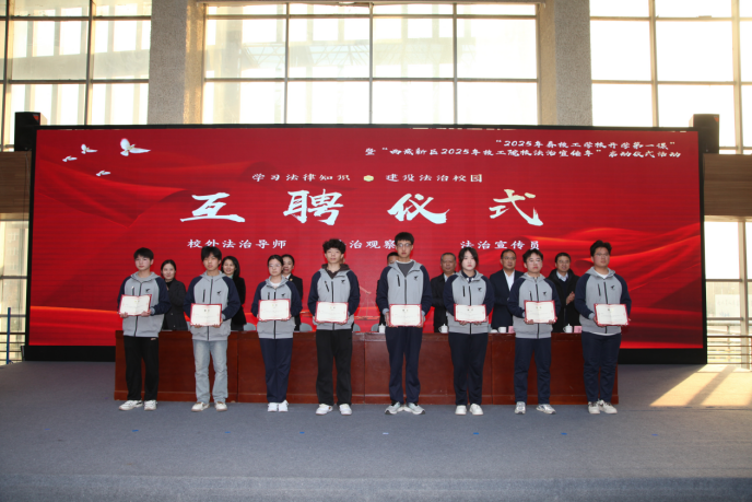 在校外法治導(dǎo)師、法治觀察員、法治宣傳員互聘儀式環(huán)節(jié),臺上領(lǐng)導(dǎo)分別為三名校外法治導(dǎo)師、兩名法治觀察員、八名法治宣傳員頒發(fā)聘書。一紙聘書,承載著沉甸甸的責(zé)任,也寄托著對校園法治教育工作的殷切期望。